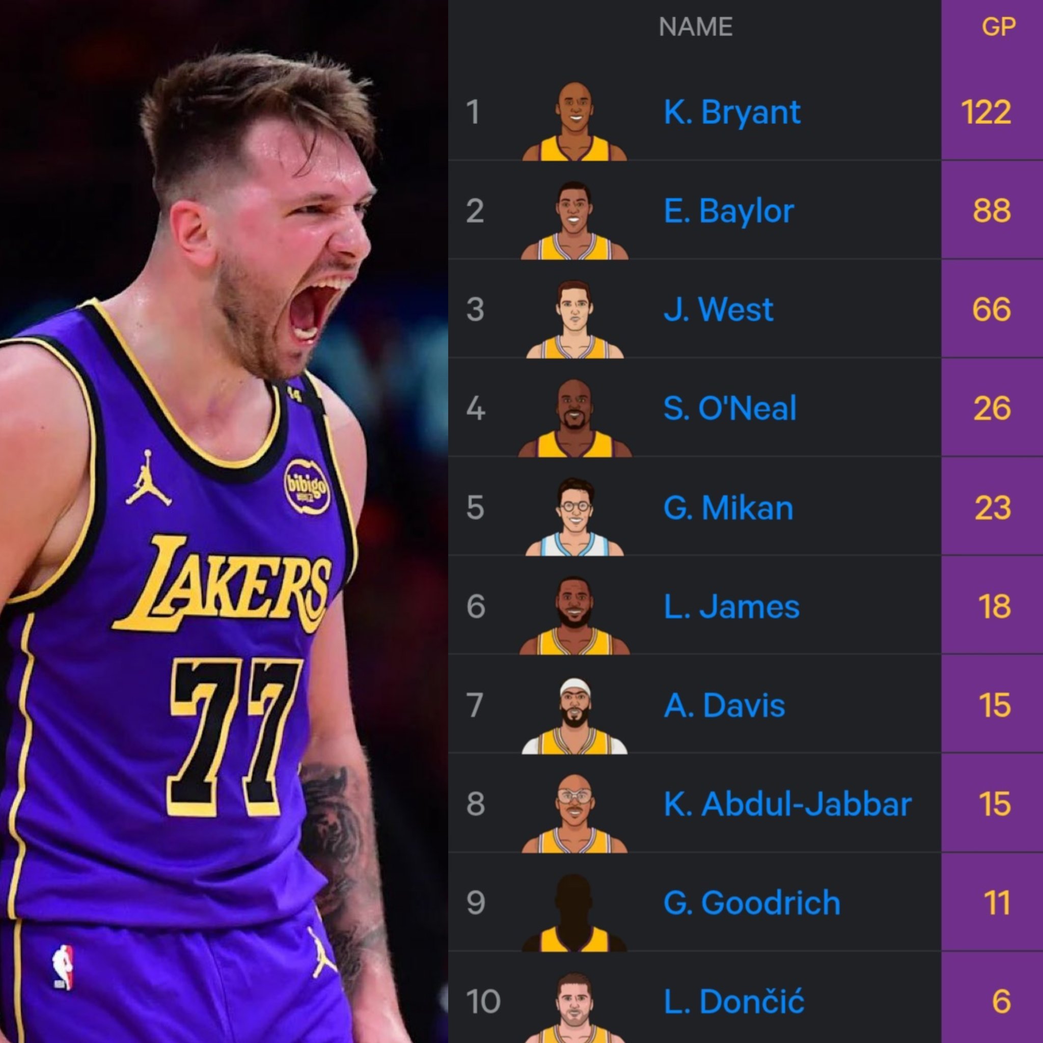 东契奇的单场40+场次已经进入湖人队史前十了。这才来了多久…