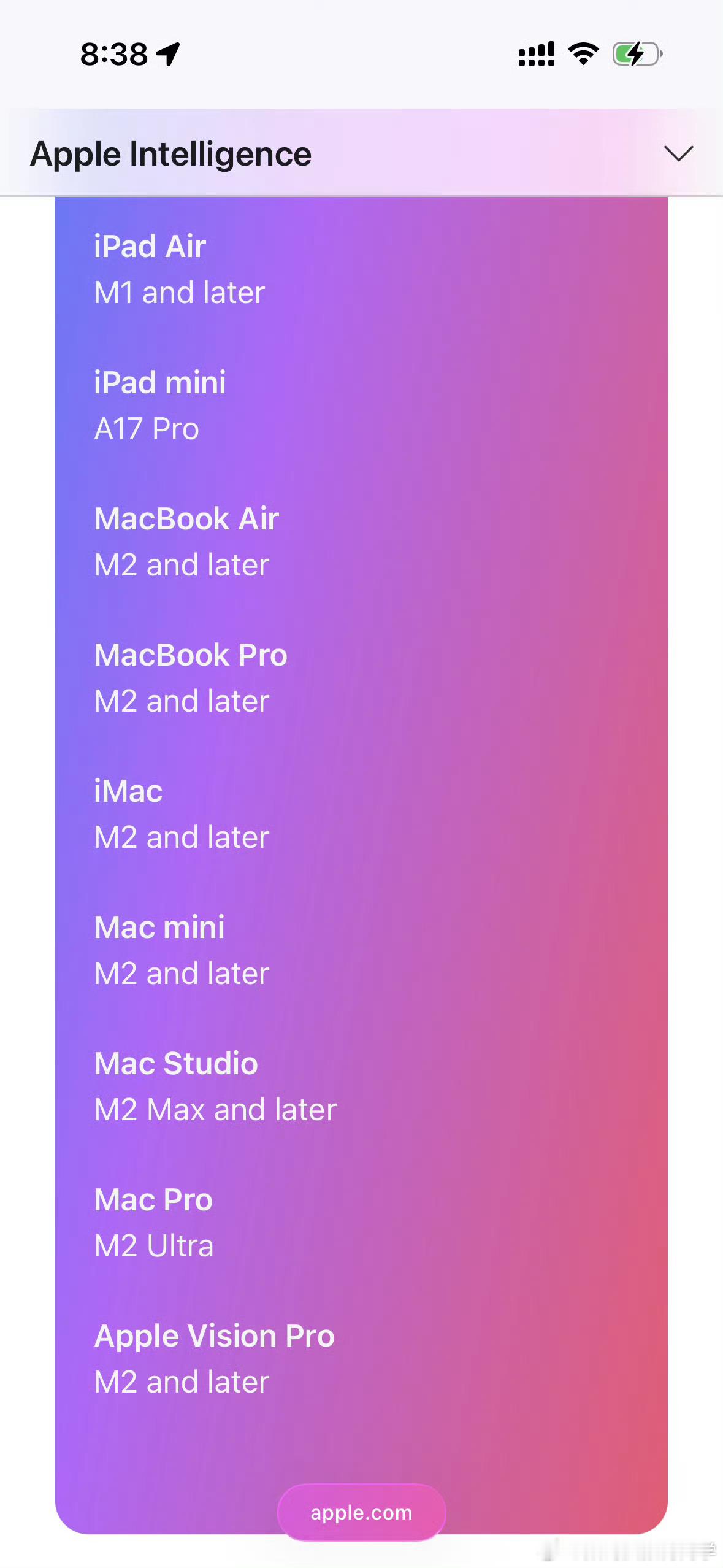 苹果美国官网,苹果 AI 最低运行要求,Mac 全都改成了至少 M2 处理器,以前写的是 M1。