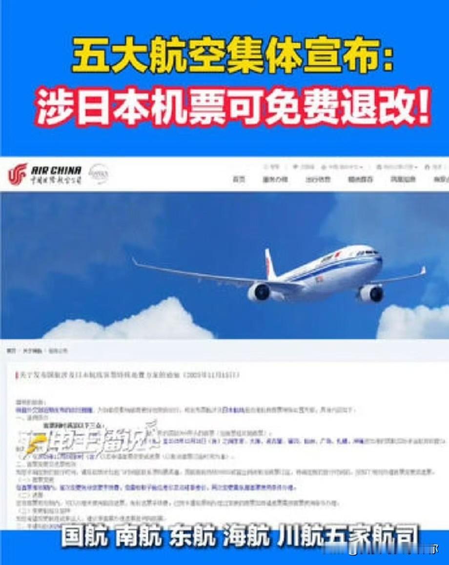 手里攥着去日本的机票, 心里正美呢吧。别急,先看看这条新消息,可能你就笑不出来了。 外交部刚说了,近期尽量别去日本。这话音还没落,国航、东航、南航,连海航、厦航这些大公司全都跟上了。十二月三十一号之前,飞去日本的票,能免费退,也能免费改。这可不是平常能有的待遇。 为啥这么大动静。那边的情况确实不太一样,治安出了些问题,有些针对咱们这边的人的案子还没破。而且,那边的人说了些不中听的话,气氛弄得挺紧张。这节骨眼上过去,心里确实不踏实。 有的人可能觉得没事,行程计划了好久,舍不得退。但想想看,万一有点什么事,人在外面,找谁帮忙呢。现在退票又不花钱,航司这次倒是很痛快,没在手续费上为难人。有北京的朋友已经顺利把票退了,拿到了全款。 原本这时候正是去日本玩的好季节,看看红叶,泡泡温泉。现在这一下,旅行社和等着接团的当地商家,怕是也要空欢喜一场了。这趟行程,看来是真的要再想想了。