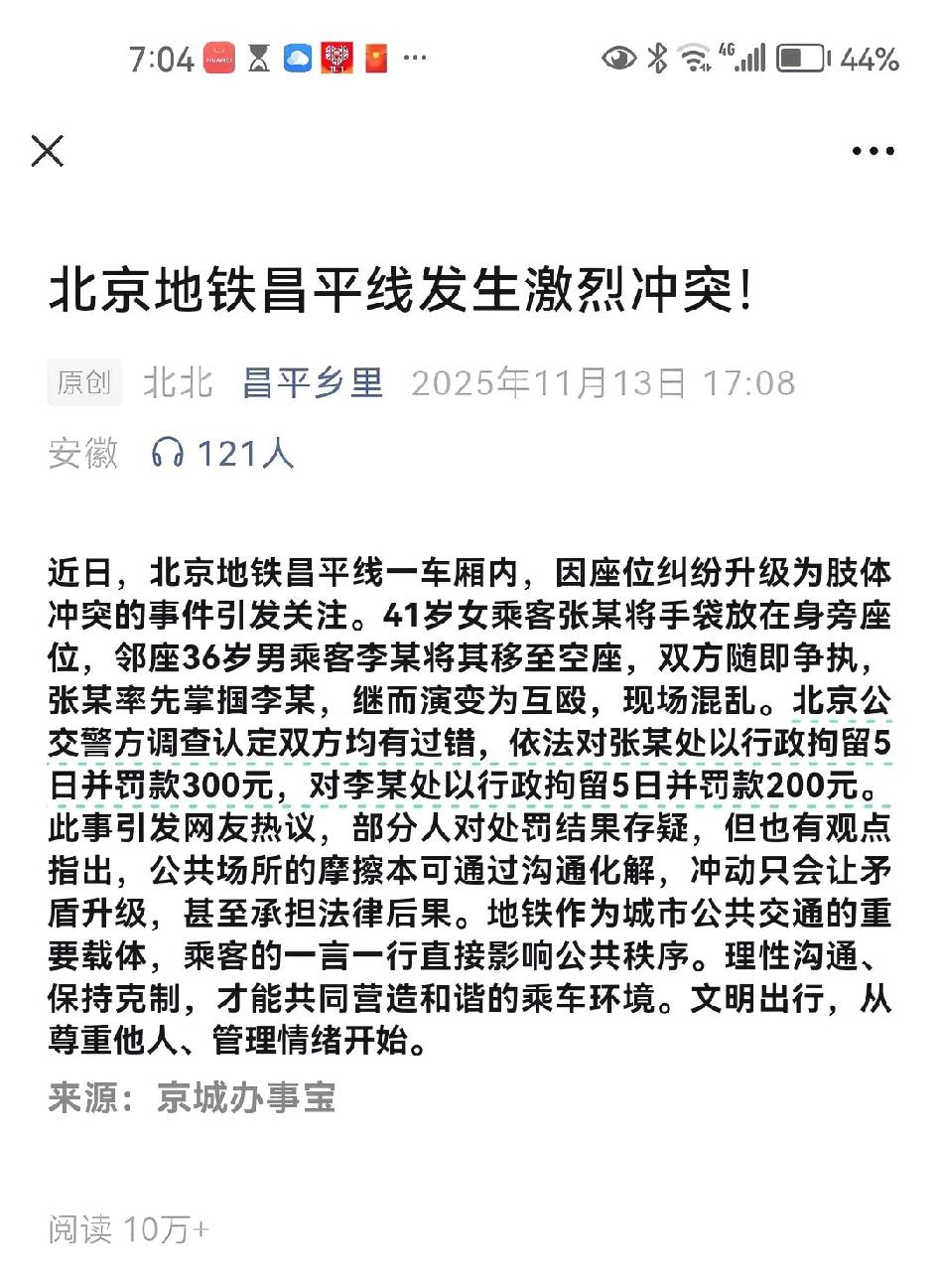 北京昌平线地铁发生男女混合大战,有人受伤吗? 近日,女方用手提袋占邻座,旁边的男方将手提袋移动到空座,两人因此爆发口角。女方先动手打了男方,进而引起男女混合双打。 最终,警方到来,判定双方都有责任,各领取拘留5天。 出门在外,和气生财,尤其在北京,被拘留过,要扣20分,落户就没戏了,一个冲动,就葬送了十几年的努力,得不偿失啊!