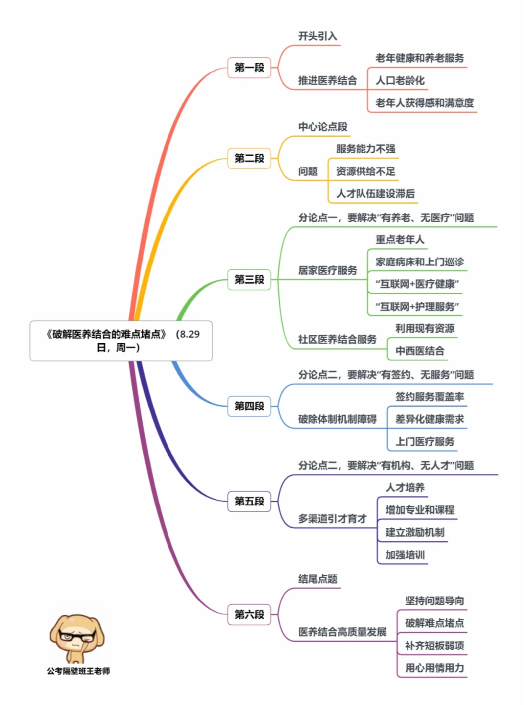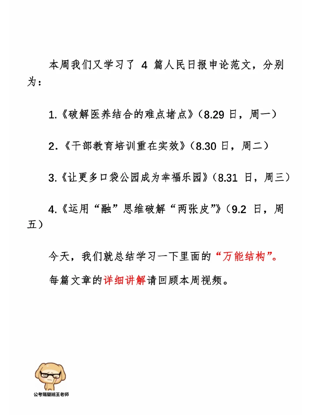 本周我们又学习了4篇人民日报申论范文,分别为: 1.《破解医养结合的难点堵点》(8.29日,周一) 2.《干部教育培训重在实效》(8.30日,周二) 3.《让更多口袋公园成为幸福乐园》(8.31日,周三) 4.《运用“融”思维破解“两张皮”》(9.2日,周五) 今天,我们就总结学习一下里面的“万能结构”。 ⭐️ ⭐️ ⭐️ ⭐️ ⭐️ ⭐️ 每篇文章的详细讲解请回顾本周视频。