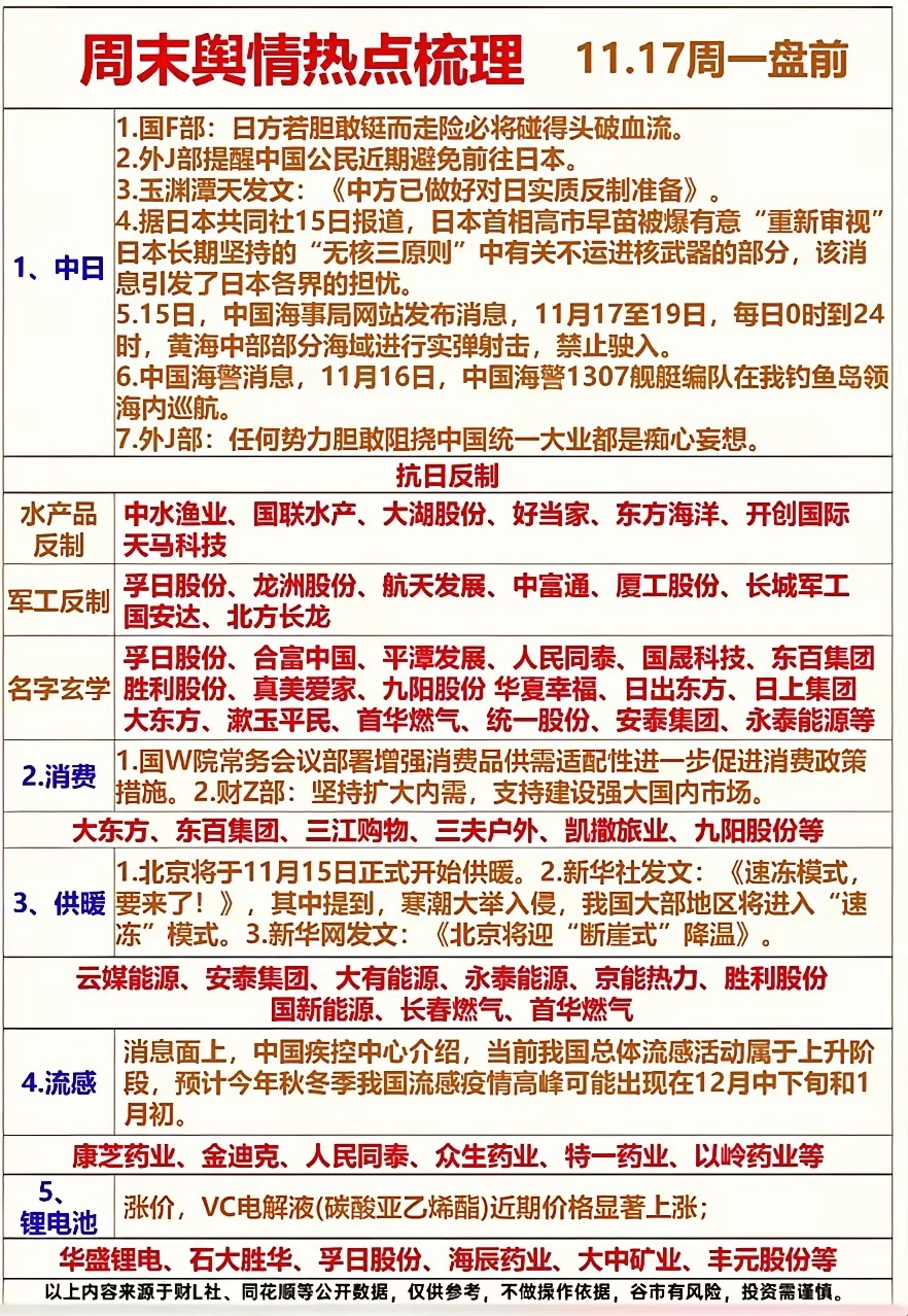 周末发酵一、统一大团圆概念福建板块最近算是比较强势板块平潭发展也是下周出池子可以关注一下漳州发展二、黄海实弹射击钓鱼岛巡航军工板块可能会有表现长城军工 、北方长龙三、反制小日子相关总龙头孚日股份(俘虏小日子)停止从日本进口水产,水产概念不出意外会大高开。中水渔业 大湖股份四、华为宣布在Ai领域有重大突破常山北明 拓维信息 华丰科技五、宇树机器人完成ipo辅导完成中大力德 长盛轴承