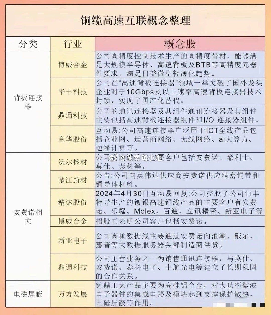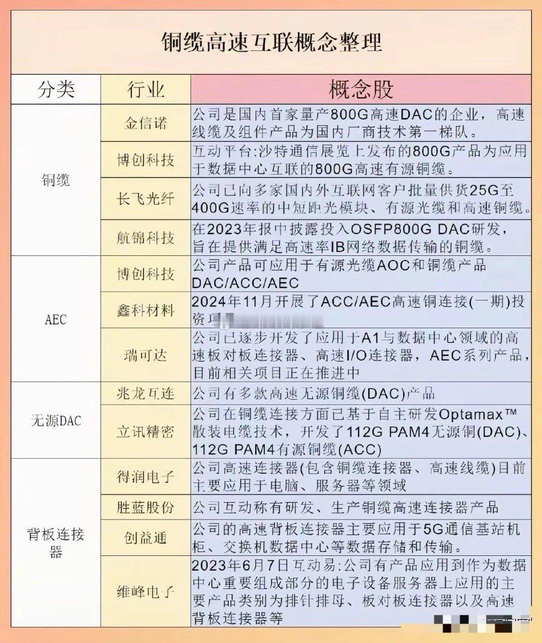 高速铜缆互联:数据中心升级的核心引擎在数据中心高速演进的浪潮下,高速铜缆互联技术因其高带宽、低功耗、低成本的优势,正成为短距离数据传输的重要解决方案,相关产业链关注度持续升温。从细分领域看,高速铜缆主要包括无源铜缆(DAC)和有源铜缆(AOC/ACC/AEC),前者结构简单、功耗低,后者传输距离更长、性能更优,共同服务于数据中心内部服务器与交换机的互联需求。背板连接器作为设备内部关键部件,技术壁垒高,国产替代进程正在加速。电磁屏蔽材料则随着设备密度和频率提升,对信号完整性和系统稳定性愈发重要,需求持续增长。当前市场对高速铜缆互联概念抱有较高热情,尤其在人工智能、云计算推动算力需求爆发的背景下,作为数据中心成本效益突出的连接方案,其发展潜力被广泛看好。随着数据速率向800G及以上迭代,相关技术及材料工艺将持续升级,产业链各环节有望迎来新一轮增长机遇。未来,技术成熟度、量产能力及标准化进程将成为影响行业走势的关键因素。