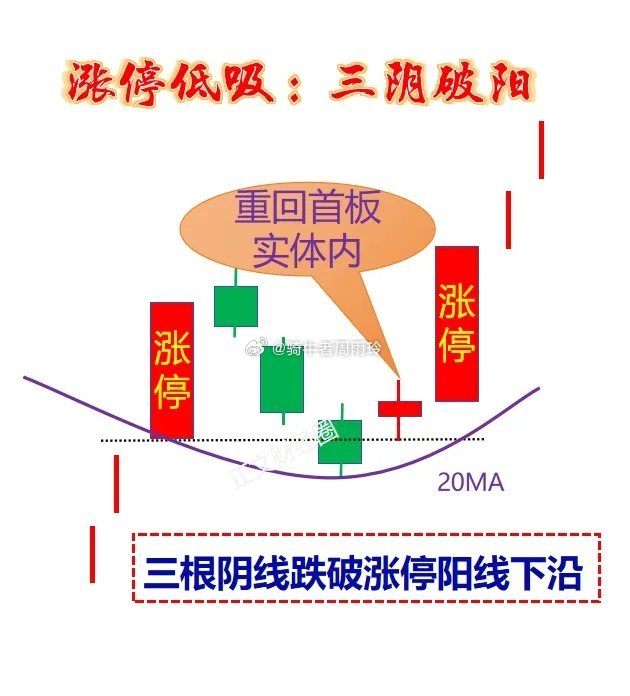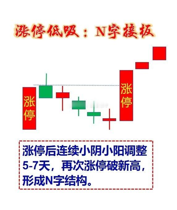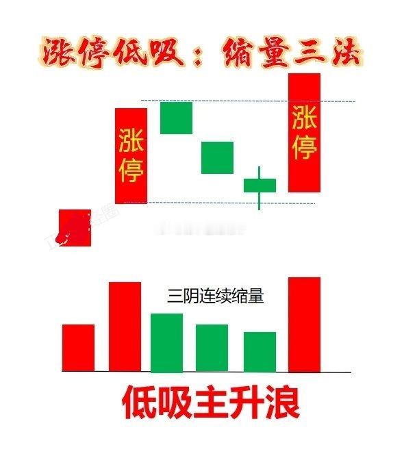 涨停低吸成功率极高的5个技巧:第1个:缩量三法——涨停后出现连续缩量3天左右,量能压的很低,说明主力惜筹并非出货,强势的一种结构,特别容易形成连板。第2个:N字接板——涨停后出现连续缩量调整,时间5-7天左右,主力拉长时间进一步清洗筹码,再次涨停形成N字型走势,下一波主升开启。第3个:放量分歧——涨停后次日高开低走的阴线,并爆大量,说明分歧大,也有出货的迹象,次日再次反包涨停,说明快速洗盘继续拉升,主力强势不做停留。第4个:突破踩5——区间震荡中,向上涨停突破,回踩不破5日线,形成上升趋势。第5个:三阴破阳——涨停后调整三根阴线跌破涨停下边沿,看似走弱,随后快速收回到涨停实体内,完成一次深度洗盘,随后继续接力上攻,值得收藏!