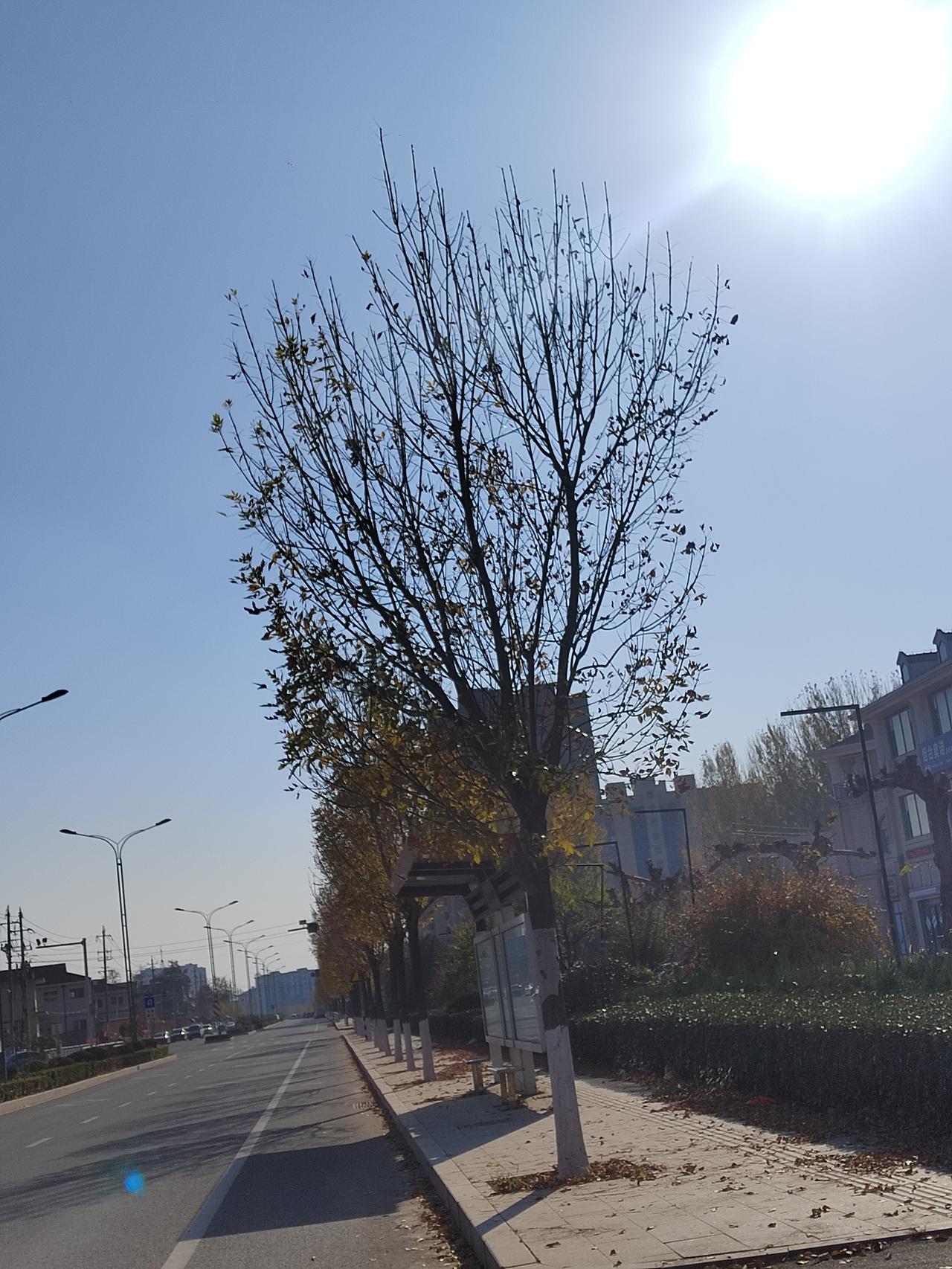 前几天回老家,依然还是满眼皆秋色,路两边满树的叶子黄灿灿的,一幅雍容华贵的样子。 一夜降温,西风横扫。 昨日的路边已是枯叶遍地,树上的叶子七零八落的,只剩光秃秃的枝条在空中随风摇曳,满眼荒凉的景象。 此一时彼一时,昨天已成过往云烟。