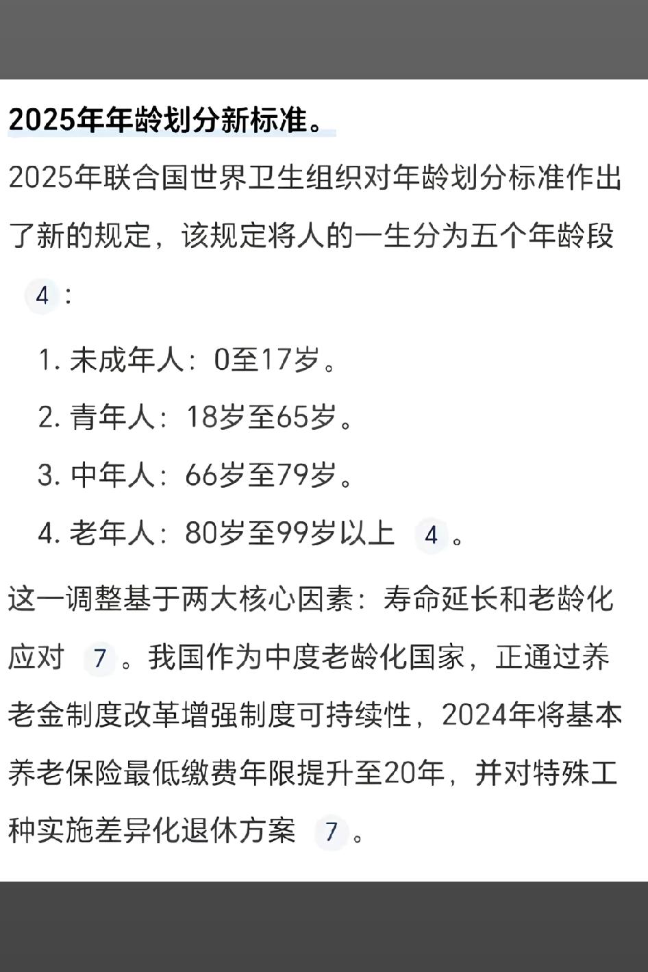 再也不用愁青春短暂了,65岁之前都是年轻人,79岁之前都是中年人,一下子解决老龄化问题 活了一个甲子,还是青年,等退休的时候就发个朋友圈:青春可真漫长啊。看见自己是青年人了,浑身上下充满了活力。记得贝吉塔说过,赛亚人为了保持战斗,所以青年时期特别长 好不容易快能领免费鸡蛋了,这一下子又得好多年。这不证明那句话吗:出走半生,归来仍是少年,只不过现在归来是青年罢了!