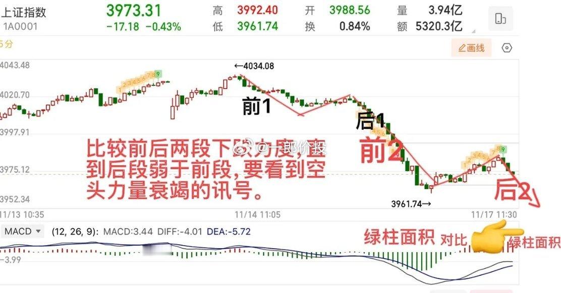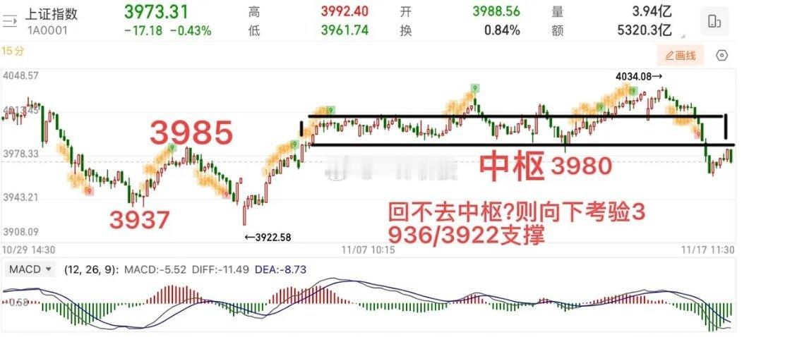 2025.11.17 周一午评:大盘低开震荡,4000点能否收复?午盘核心观点:上证指数今日低开后维持小幅震荡整理,结构层面核心矛盾仍围绕中枢区间展开方向选择。早盘指数跌破中枢下沿后,当前可视为对中枢的回抽确认,关键在于能否重新拉回中枢区间延续震荡——若反抽未能站稳3980点上方(3985点颈线位为核心压力),则大概率会继续向下寻求支撑,后续或将考验3936点/3922点区间的支撑强度。均线维度来看,下方20日均线的得失将成为短期强弱的重要判断依据。从5分钟级别走势(如图所示)分析,自4034点开启的下行波段中,需重点关注多空力量的强弱对比,通过下跌力度的前后差异判断空头是否衰竭:只有当后续下跌段落的力度弱于前一段,才能初步判定空头动能放缓。综上,若反抽无法突破3980点上方(3985点颈线),指数仍有向下测试3936点/3922点支撑的可能,需持续通过下跌力度对比跟踪空头力量变化。结构上,当前更倾向于演变为宽幅震荡格局,而非明确的下跌趋势,因此指数回调无需过度恐慌,回调过程中可视为结构性机会的布局窗口。个人观点,仅供参考!