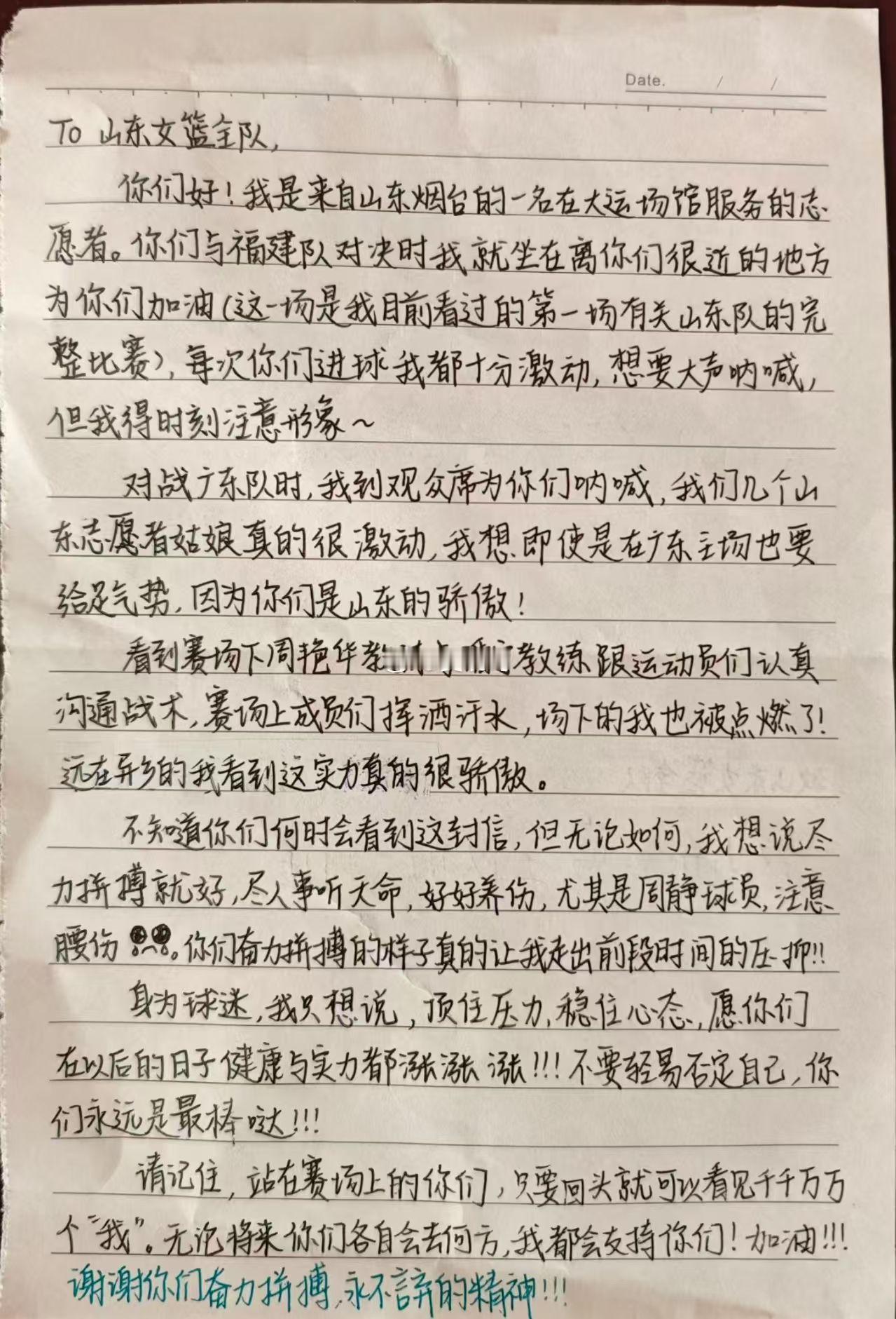 这位来自山东的志愿者,你的信,山东U22女篮的全体教练员队员工作人员都看到了,周艳华指导和潘宁指导也都看过了,她们很感动,感谢你默默地支持,山东篮球离不开每一个“你”的支持,她们希望你学业有成,一切都好。