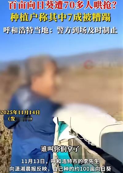 内蒙古呼和浩特,男子承包了400亩地,全部种植向日葵。辛辛苦苦一年,眼看到了收割的季节, 却遭到附近村民的哄抢和糟蹋,导致100亩的向日葵颗粒无收,损失高达50万。 男子气不过,报警求助,村民:听说这里的向日葵不要了,看着大家都来摘,我们这才顺手摘几个,要是知道就不来了。 本以为法不责众,结果,民警的处理让村民们傻眼了。 这损失太大了,100亩全没了,直接损失50万,李先生的钱全赔进去了,辛苦一年,啥也没落着,起因是张某造谣。 他说向日葵没人要,大家都信了,觉得没事,法不责众嘛,李先生是外地来的,荒地开垦多不容易啊,村干部说,村民只是少量采摘,不算哄抢,街道办也承认监管不力,一开始是零星的,后来变群体的了 最后,新城区分局给这事定性为“葵花被盗”,拘留了人,这事反映出村民法律意识淡薄,分不清公私。 之前也有类似的,赤峰免费砍白菜,也是因为谣言,把种植户坑了八万多,还有河南红薯哄抢, 让种植户血本无归,都是因为谣言,大家觉得人多没事,受害的都是农民,损失惨重,哄抢就是犯法,不管多少人,都得负责,治安管理处罚法和刑法都有规定的。 大家都在想,逃走的村民能不能抓住,能赔李先生的钱吗 尊重别人劳动成果是基本的道德,希望公平处理,保护农民的利益,法不责众不是借口,谁侵犯别人财产,都要受到惩罚。