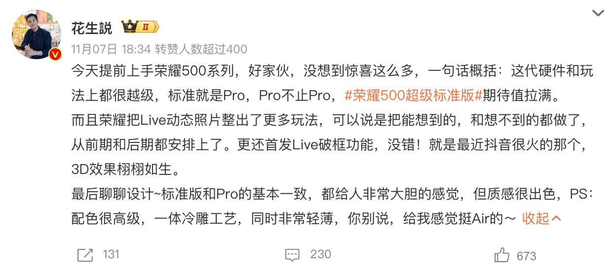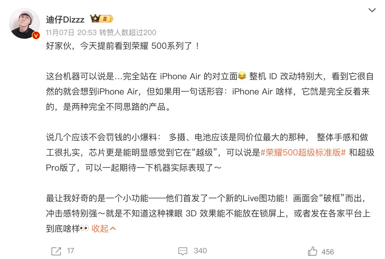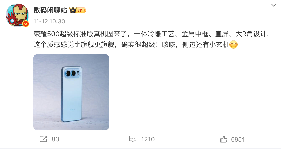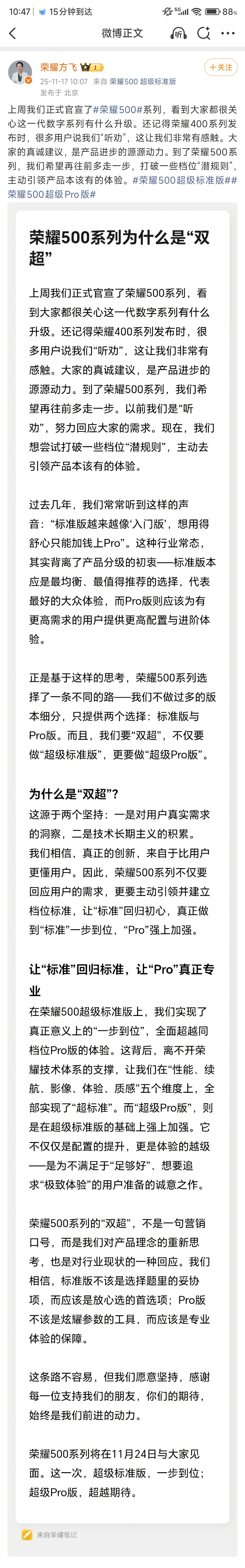 今日,荣耀方飞发长文解读“双超”,在行业减配乱象背景下,为了让用户有远超标准的用机体验,荣耀500系列不止听劝,更对产品“动真格”!配置全维加码,体验全面升舱,全系搭载骁龙8旗舰芯,续航再度刷新档位记录,一体冷雕玻璃看齐iPhone,在高价低配的行业惯例中,荣耀选择为用户硬刚到底,11月24日,看荣耀如何重新定义行业标准。