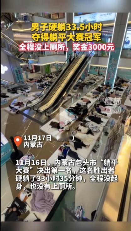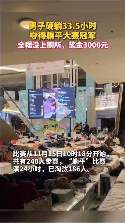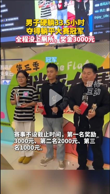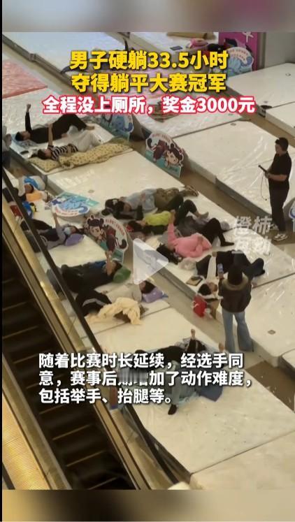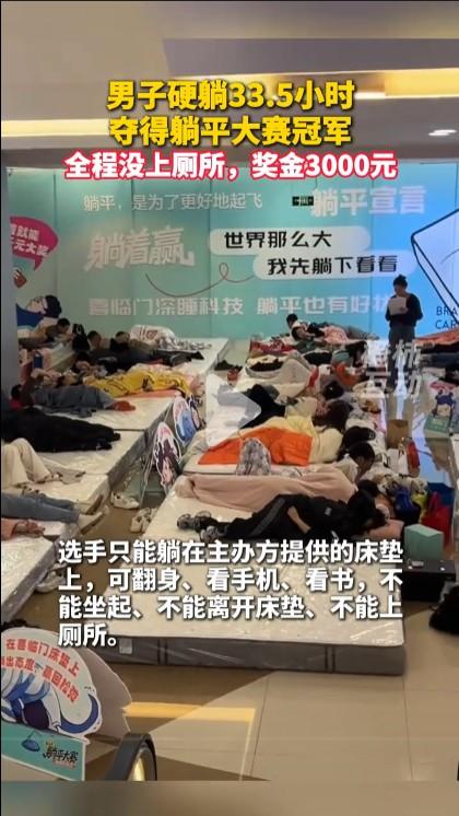 不知道有关部门为什么会允许这样的毫无意义的比赛举办。让选手全程躺在床垫上,不准上厕所和坐起,不仅严重影响选手身体健康,而且没有任何积极意义。虽然有的选手穿戴纸尿裤,但无论是大便还是小便后,不及时更换对皮肤的损害还是非常大的。而且有的选手为了赢得比赛可能硬是不吃不喝和憋屎憋尿,对人体的损害更大。为了几千元的奖励如此糟蹋自己值得吗?出了事主办方要承担责任!
