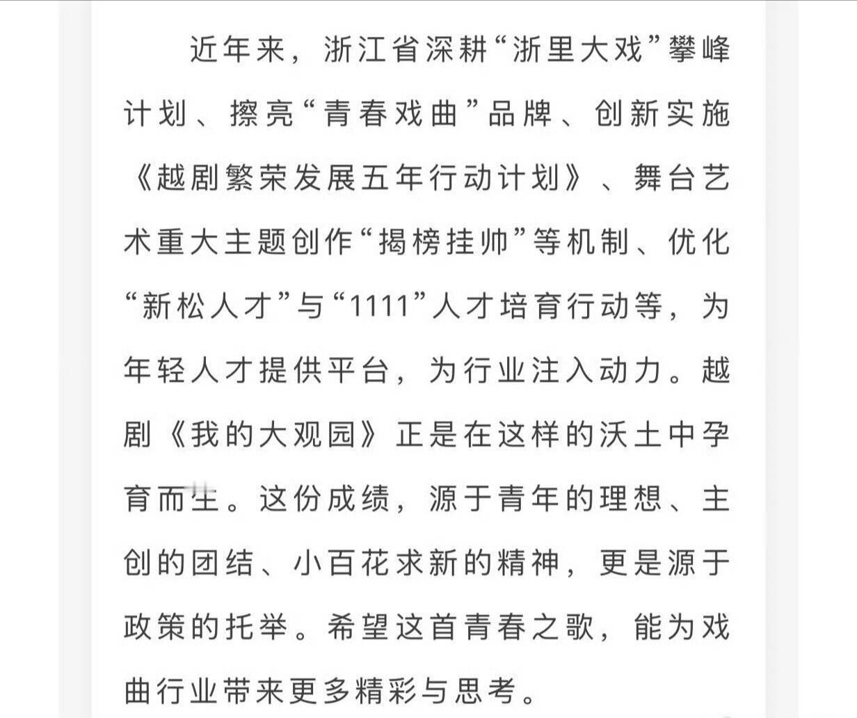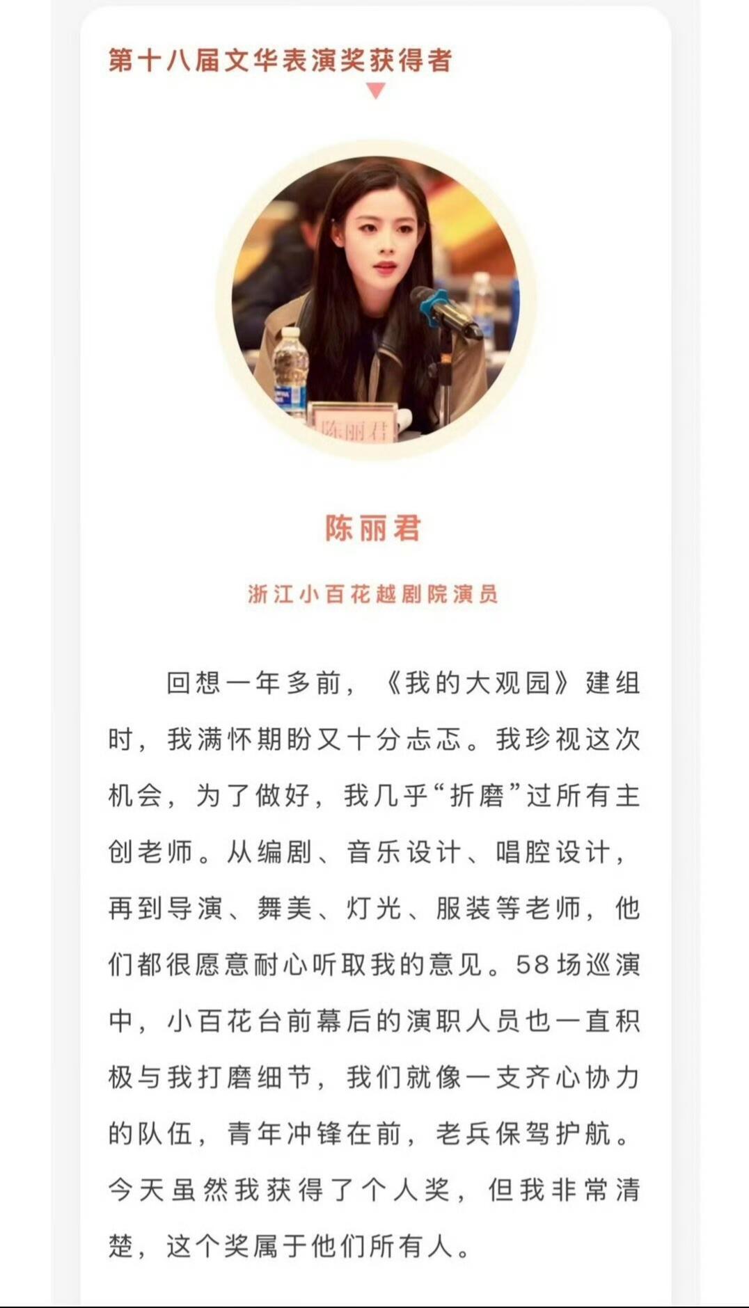 第十八届文华奖获奖单位和代表座谈会陈丽君发言;“作为文华表演奖获奖代表之一,陈丽君发言,她谦虚的说,《我的大观园》是一支齐心协力的队伍,这个奖属于所有人”君君好棒啊,青年演员的榜样