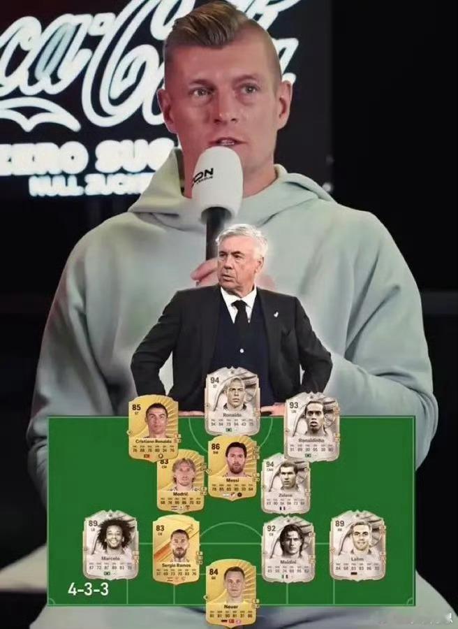托尼·克罗斯说出了他心中的最佳十一人阵容,由安切洛蒂担任教练。门将:诺伊尔后卫:马塞洛、拉莫斯、马尔蒂尼 、拉姆中场:莫德里奇 、齐达内 、梅西前锋:C罗纳尔多、罗纳尔迪尼奥、罗纳尔多