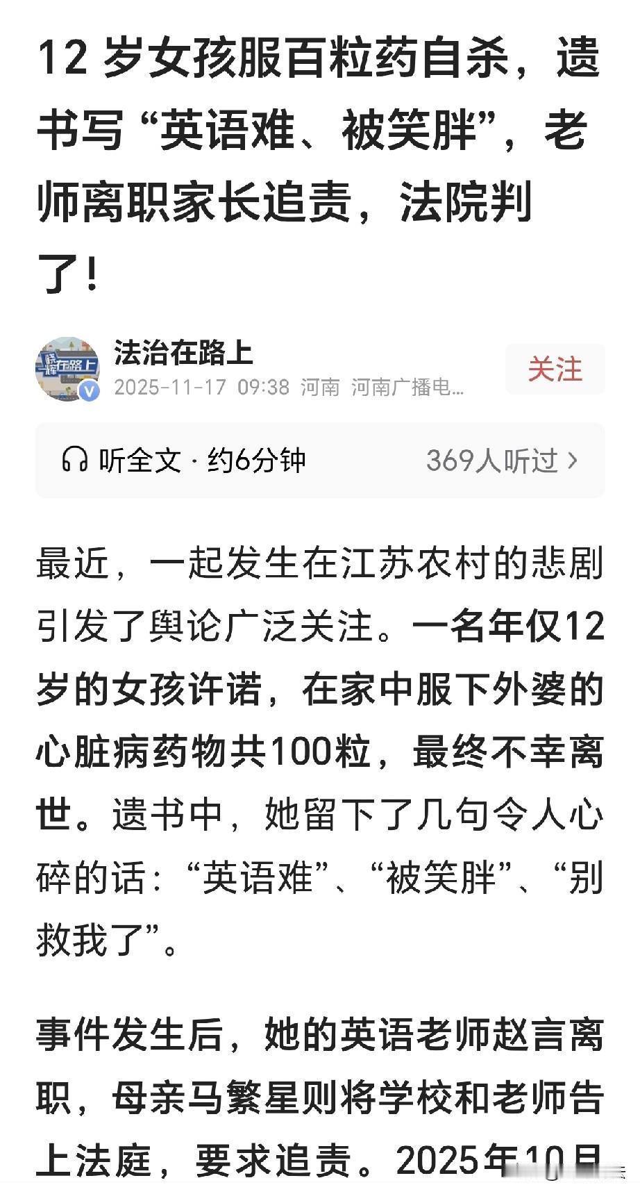 江苏,一12岁女孩上小学6年级,父母离异,她和母亲住在外公外婆家里,一天晚上,她独自待在房间,写下一封遗书: 我好累,我不想醒过来了,我想死,妈妈对不起,日复一日的学习,好累好累,一直不会写的英语单词……随后,她吞下100粒药片去世,女孩母亲认为,这和英语老师脱不了干系,她告到法院,要求学校和英语老师赔偿,法院判了! 2012年10月1日,许诺呱呱落地,新生命的到来,让家里充满了喜悦的心情。 外公外婆和爷爷奶奶,对这个孙女非常喜爱,就连给她过生日,都得两边都过一遍。 谁知2018年的时候,许诺父母离婚,母亲马繁星带着她独自生活。 马繁星和前夫虽然感情不和,但是他们都爱孩子,俩人一直也没有再婚,他们只有许诺一个孩子。 2024年2月,马繁星带着许诺回到了外公外婆的家里,家里离县城有30多公里。 外公家的房子是自建房二层小楼,外面有宽阔的院子,许诺自己住在二楼。 许诺在二楼能看到外面的情景,这里的人都以养蟹为生。 谁知几个月后,许诺的农历生日刚过6天,家人万万没有想到,12岁的许诺的生命戛然而止。 事发当天,是周一的时候,许诺因为肠胃炎向学校请假在家休息,此时此刻,母亲马繁星在外地医院治疗阑尾炎。 外公一大早就去了蟹塘,那是一家人的生计,需要好好的进行料理。 吃过晚饭,许诺就回到了二楼,外婆上来看她,看见她趴在泡沫垫上写着作业。 外婆心疼的问她,怎么写了这么多的作业,许诺说她有事,要外婆先下楼去。 外婆蹒跚往楼下走去,谁知没过多久,听到楼上有咚咚的声音,外婆又急忙上楼,发现许诺面朝下趴在地上。 外婆以为是她睡着,急忙上前拉起许诺,谁知发现她面部青紫,外婆急忙大声呼救。 邻居帮忙叫外公回家,还帮他们叫了救护车来。 随后,救护车,警车,马繁星的前夫全都到了。 马繁星也接到电话,等她赶回家中,只看见女儿躺在地上,像睡着一样的安 详。 女儿在房间里留下了一封遗书,一旁桶里扔着一个空药 瓶子。 瓶子里装的是外婆治疗心脏病的药片,瓶子是刚开封的状态,整整一百粒药,被许诺全部吃下。 许诺在遗书里写到:“ 我好累,我不想醒过来了。我想死,妈妈对不起,日复一日的学习,好累好累,一直不会写的英语单词。” “一次作业不写就要去的办公室……我受不了,回来还要被你们嘲笑胖,我累了,别救我了。” 马繁星不敢相信,女儿就这么走了,她抱住女儿嚎啕大哭。 今天中午女儿还给她打过电话,叮嘱她注意身体、心态要好…… 第二天早晨,许诺英语老师赵言接到了电话,班主任告诉她说,许诺去世,在遗书上写了“英语难”三个字! 赵言惊呆,她刚接手这个班级一个月,对许诺刚才熟悉。 她心里一阵刺 痛,刚开学时候,她和几个学生谈心,他们都是对英语的学习有一定的困难。 许诺就在其中,她还主动说过,想要好好学英语,许诺服药去世,让赵言心里像扎了根刺。 马繁星无法接受女儿离世的事实,她翻看女儿的聊天记录,发现女儿曾多次向同学提到“作业多”“要去办公室”“很 烦”的话题。 马繁星认为,女儿的去世与学校和老师脱不了干系。 她觉得学校从未家访,老师也没主动和她说过孩子在校情况,让她误以为孩子在学校一切安好。 赵言委屈,她才带课一个月,从未来没有单独叫过许诺去办公室。 她每次叫学生来,都是找几个同学一起,总共就叫过三四次。 她从未让许诺罚站,让同学抄写是为了加深记忆。 许诺遗书中写到,回去被你们嘲笑胖,遗书中的“你们”,马繁星认为指的是回到班级,校方则认为指回到家里。 2024年11月,马繁星将学校和赵言告到法院,她认为女儿长期遭受侮.辱和体罚,这才导致了女儿自行服药去世,学校未尽到管理保护职责。 同时,她要求赔偿,并撤销此前和学校签订的《调解协议书》。 那份协议里写着,学校支付2万元人道主义慰 问金,家属同意不再追究。 但马繁星说,当时因为太过悲痛,自己没有判断能力,协议中写的是女儿突发疾病死亡,与女儿服药去世的事实并不符合。 《民法典》第1200条规定: 限制民事行为能力人在学校或者其他教育机构学习、生活期间受到人身损害,学校或者其他教育机构未尽到教育、管理职责的,应当承担侵权责任。 英语老师赵言仅开展正常教学,叫学生到办公室也是多人同行的辅导行为,并无体罚、侮辱等违规情形。 学校也无证据显示存在教育管理上的明显疏漏。 因此法院认为,许诺服药去世是学习压力、可能的身心困扰等多元因素导致,老师的正常教学与自杀结果间无法认定直接因果关系 2025年10月30日,一审判决,驳回了马繁星的诉讼请求。 赵言离开了学校,她心里懊恼委屈,表示再也不会额外辅导学生了。 而马繁星离开了家乡,搬到了城里的单身公寓,女儿的去世成了她一生挥不去的心痛。 关注@王哥说法 多学法律少吃亏!