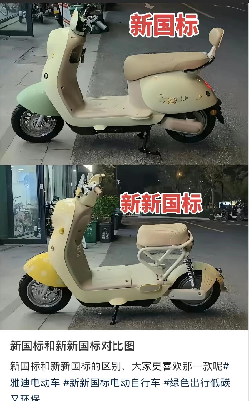 新国标和新新国标对比图,新国标和新新国标的区别,大家更喜欢哪一款呢 设计电动车的人,可能因为他不开电动车,雨衣都没有地方挂了,下雨天雨衣都不好穿,遇下雨天屁股会不会凉飕飕的。后面货架去掉,不允许带货,谁带货抓到罚款50。 还好现在的车结实,虽然被滴滴撞过,骨架掉了点漆,不过没碰到电机,所以没大事,这套配套电池用坏了,就换BYD到锂电池,再战几年