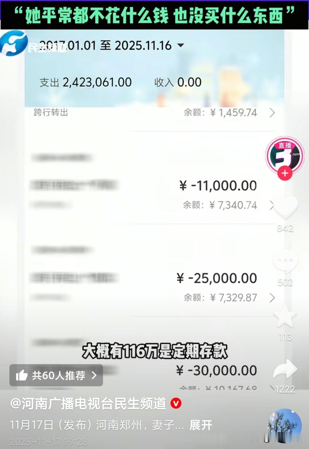 原来8年之痒是真的, 丈夫挣的是辛苦钱,妻子在家挥霍116万存款,为了撑场面豪掷